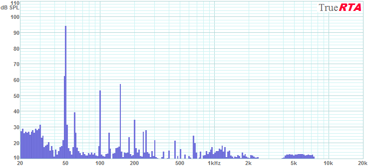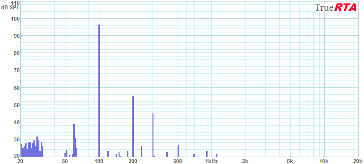 As a low frequency stress test I tried to drive the array to 10% distortion at 50 Hz. This is one measure of the maximum operating level of a speaker in the low bass range. Figure 5-13 shows the array operating at the highest level I could generate before the everything in the room started vibrating loudly. The system reached 113 dB SPL at 50 Hz with 65 Watts of drive level (18.7 Vrms into 5.33 Ohms). The dominant distortion is 2nd harmonic at -26 dB or 5% distortion. The 3rd harmonic is at -29 dB or 3.5%. The 5th harmonic was only at -48 dB or 0.4%. This is excellent high SPL low bass performance! A single array can drive the ROOM to the limit of what it can take with just 65 Watts at 50 Hz. At the highest levels a person (or room) can stand (113 dB SPL in this case) the distortion does not exceed 5% at 50 Hz.