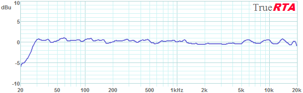 Figure 5-2 shows the same measured frequency response as above but this time with more conservative 1/6th octave smoothing. The frequency response is seen to be within +/- 1.5 dB from 28 Hz to 20 kHz. This 1/6th octave smoothed response probably corresponds most closely with what you would actually hear from the system as 1/6th octave corresponds to the "critical bandwidth" of human hearing in the range above 1 kHz. Below 1 kHz the critical bandwidth gets progressively wider as the ear becomes less discerning and greater smoothing could be used without misrepresenting what we would hear. So above 1 kHz we don't want to use any more than 1/6th octave smoothing. Below 1 kHz the 1/3rd octave smoothed response of Figure 5-1 above is more representative of our ear's response.