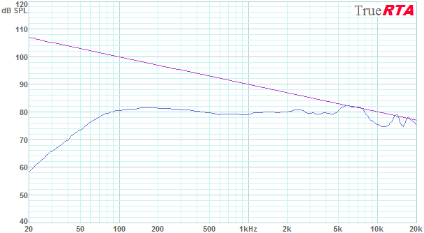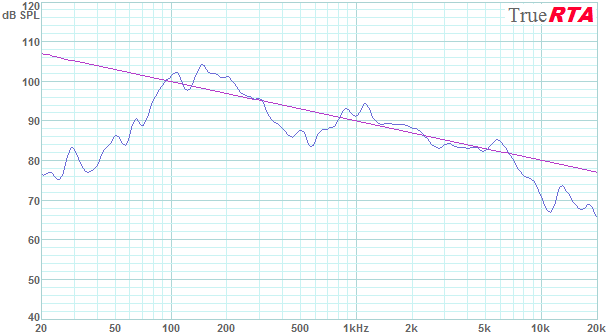 The frequency response in Figure 5-6 was measured with a drive voltage of 2.309 Vrms which corresponds to 1 Watt into the array's nominal impedance of 5.33 Ohms. Note the very large build in efficiency in the 100 to 200 octave where the array has an efficiency exceeding 100 dB SPL for 1 Watt over the 1 to 3 meter range. With the array receiving an input of 1 Watt each driver was being driven at 1/24 Watt or .042 Watts. While producing over 100 dB SPL in the 100-200 Hz bass range the drivers are just being tickled a bit with 42 milliwatts of drive. Operating the array at 100 Watts (or just over 4 Watts per driver) would add 20 dB to the above levels. The usual 1W/1meter sensitivity specification of a typical speaker is not appropriate for an array. Instead we would have to indicate sensitivity at a specific frequency or preferably, just show sensitivity a graph as above. Figure 5-7 shows the measured response along with a -3 dB per octave slope for comparison.