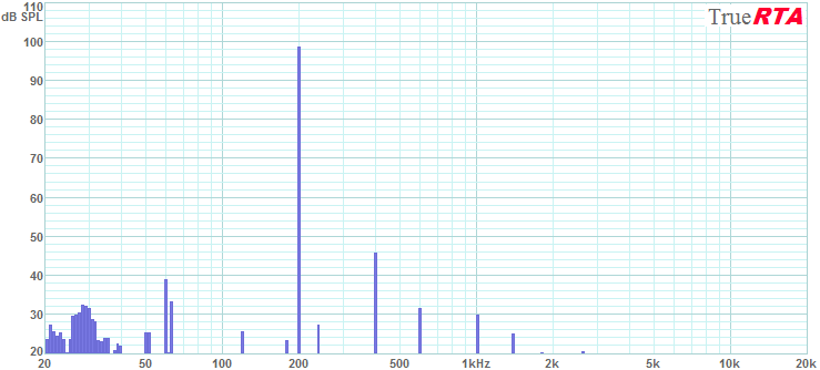 Next in Figure 5-9 we see the array at reproducing a 200 Hz sine wave at an incredible 98 dB SPL with only 1 Watt of input. The distortion is quite low compared to any loudspeaker I've measured. The 2nd harmonic at 400 Hz is down 52 dB or 0.25% distortion. The 3rd harmonic (600 Hz) is at -66 dB or 0.05% distortion. The higher harmonics continue to descend in level even further.