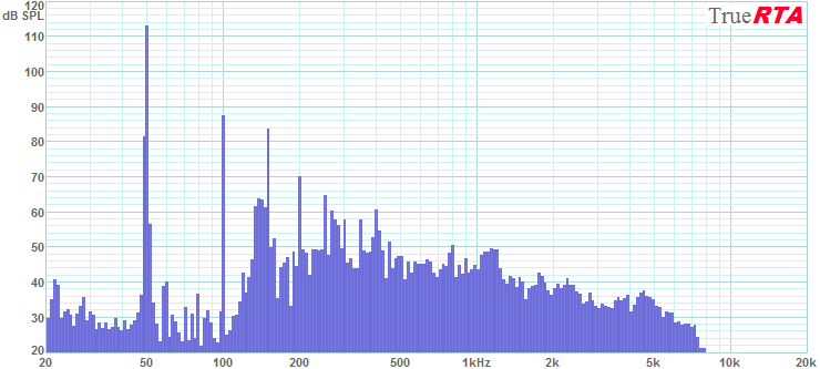 As a low frequency stress test I tried to drive the array to 10% distortion at 50 Hz. This is one measure of the maximum operating level of a speaker in the low bass range. Figure 5-13 shows the array operating at the highest level I could generate before the everything in the room started vibrating loudly. The system reached 113 dB SPL at 50 Hz with 65 Watts of drive level (18.7 Vrms into 5.33 Ohms). The dominant distortion is 2nd harmonic at -26 dB or 5% distortion. The 3rd harmonic is at -29 dB or 3.5%. The 5th harmonic was only at -48 dB or 0.4%. This is excellent high SPL low bass performance! A single array can drive the ROOM to the limit of what it can take with just 65 Watts at 50 Hz. At the highest levels a person (or room) can stand (113 dB SPL in this case) the distortion does not exceed 5% at 50 Hz.